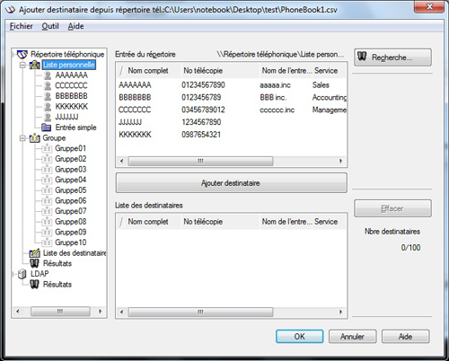 Vous pouvez également enregistrer un destinataire en faisant glisser le nom de la [Liste personnelle] vers un groupe. Toutefois, vous ne pouvez pas supprimer le destinataire du groupe en déplaçant le nom.