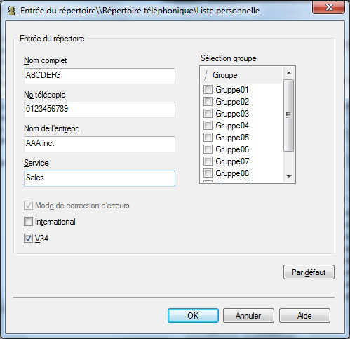 [Sélection groupe] | Quand vous ajoutez un destinataire au groupe, cochez cette case de groupe. Vous pouvez aussi ajouter un destinataires à plusieurs groupes. Une fois ajouté, vous pouvez spécifier des destinataires en sélectionnant leur groupe (pour diffusion). Si vous envoyez fréquemment des fax à certains membres, il peut s'avérer utile de les ajouter à un groupe. |