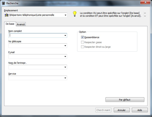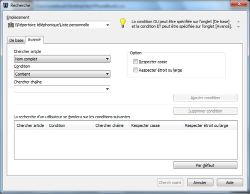 La recherche [Avancé] affiche le destinataire qui correspond à toutes les conditions de recherche. Sélectionnez [Chercher article] et la [Condition]. Saisissez ensuite les caractères à rechercher, puis cliquez sur [Ajouter condition]. Spécifiez plusieurs conditions de recherche, le cas échéant, puis cliquez sur [Cherch maint].
