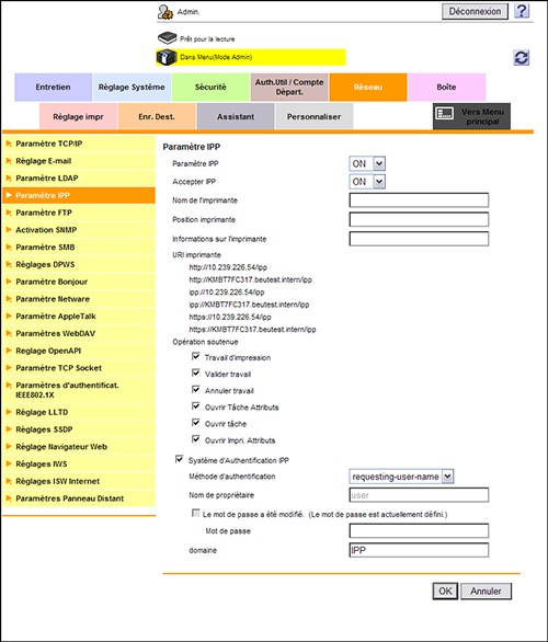 En mode Administrateur, sélectionnez [Réseau] - [Paramètre IPP], puis configurez les réglages suivants.