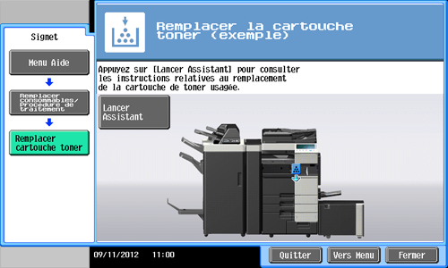 Tapez sur [Remplacer consommables/Procédure de traitement] - [Remplacer cartouche toner] - [Lancer Assistant].
