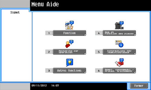 Le Menu Aide se compose des éléments suivants. Voir et contrôler un aperçu ou une procédure opératoire d'une fonction spécifique.