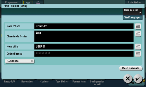 [Dossier destination] | Entrez le nom du dossier partagé de l'ordinateur spécifié dans [Nom d'hôte] (255 octets max.). Le nom du dossier partagé se réfère généralement à un nom partagé.