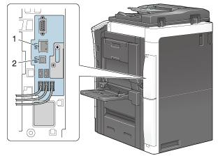 1 | Ethernet-Anschluss (1000Base-T/100Base-TX/10Base-T) | Verwenden Sie das LAN-Kabel, um dieses System an das Netzwerk anzuschließen. Dieses System unterstützt die Protokolle 1000Base-T, 100Base-TX und 10Base-T. Die TCP/IP-Protokolle (LPD/LPR, IPP und SMB) und Webservices werden unterstützt. |