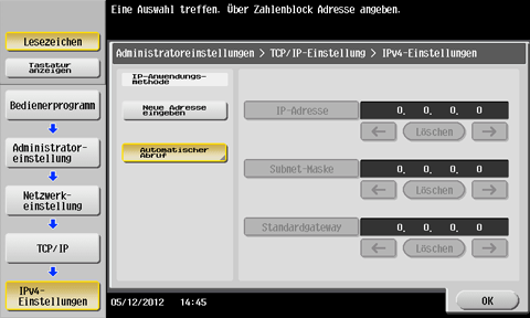 Tippen Sie am Bedienfeld auf [Bedienerprogramm] - [Administratoreinstellung] - [Netzwerkeinstellung] - [TCP/IP] - [IPv4-Einstellungen] und richten Sie dann die folgende Einstellung ein.