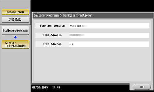 Drücken Sie am Bedienfeld auf [Bedienerprogramm] - [Geräteinformationen] und prüfen Sie dann die IP-Adresse dieses Systems.