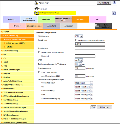 Definieren Sie die Einstellungen für POP über SSL und APOP entsprechend Ihrer Umgebung. Wählen Sie im Administratormodus [Netzwerk] - [E-Mail-Einstellung] - [E-Mail empfangen (POP)] aus und konfigurieren Sie die folgenden Einstellungen.