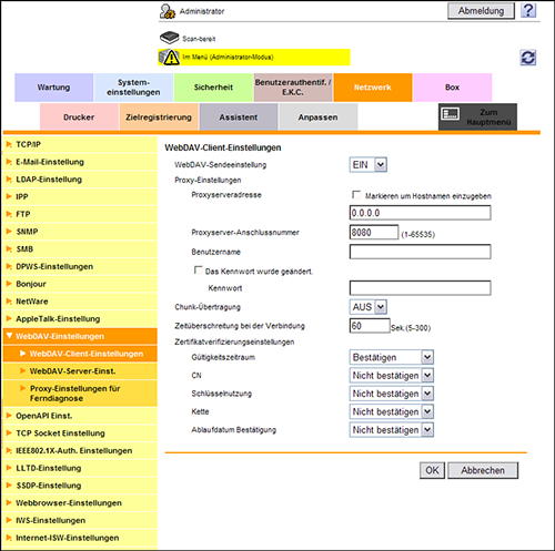 Wählen Sie im Administratormodus [Netzwerk] - [WebDAV-Einstellungen] - [WebDAV-Client-Einstellungen] aus und konfigurieren Sie dann die folgenden Einstellungen.