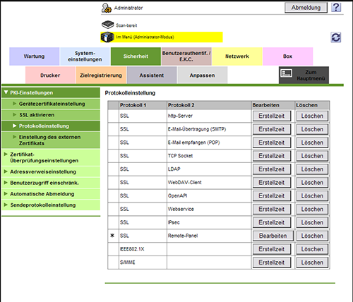 [SSL] | [Webservice] | Wenn dieses System als Web-Service-Server verwendet wird, wird die Übertragung von einem Client zum System verschlüsselt. Er wird verwendet, wenn ein Computer unter Windows Vista oder einem Nachfolgebetriebssystem über HTTPS auf dieses System zugreift. |