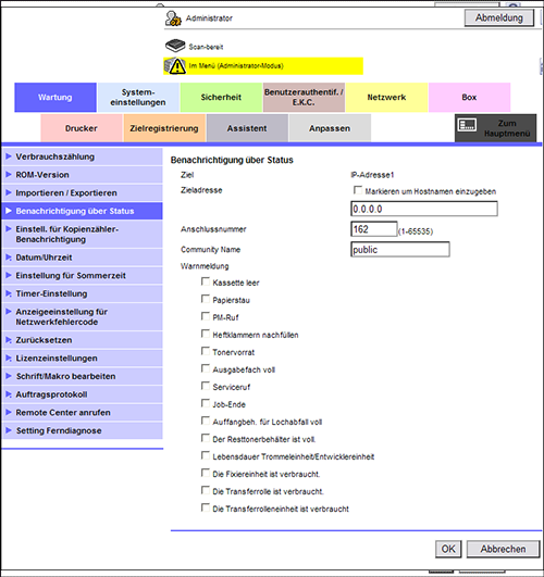 Wenn Sie die Systemstatusbenachrichtigung mit der SNMP TRAP-Funktion verwenden möchten, wählen Sie im Administratormodus [Wartung] - [Benachrichtigung über Status] - [IP-Adresse] oder [IPX Adresse] - [Bearbeiten] und richten Sie dann die folgenden Einstellungen ein.