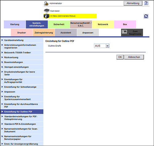 Wählen Sie im Administratormodus [Systemeinstellungen] - [Einstellung für Outline PDF] und richten Sie dann die folgenden Einstellungen ein.