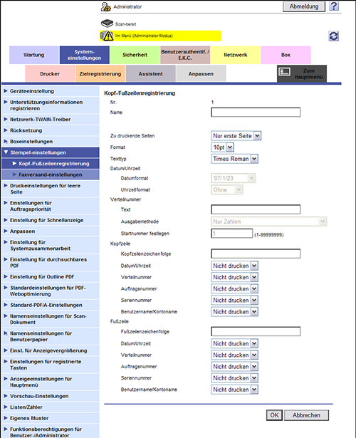 Wählen Sie im Administratormodus [Systemeinstellungen] - [Stempeleinstellungen] - [Kopf-/Fußzeilenregistrierung] - [Bearbeiten] und richten Sie dann die folgenden Einstellungen ein.
