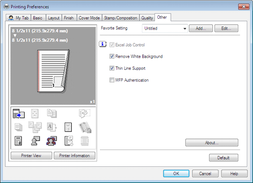 [Excel Job Control] | Select this check box to print multiple Microsoft Excel sheets with different page settings at one time. When multiple sheets with different page settings are printed at one time, the sheets may be separated into single-sheet jobs depending on the data contained. This function avoids job separation as much as possible. |