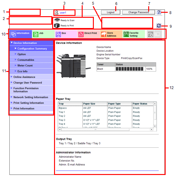 4 | Status display | Displays the status of this machine. Displays the status of the printer and scanner sections of this machine with icons and messages. If you click this icon when an error occurs, you can check the error status such as consumables, paper trays, or user registration information. |