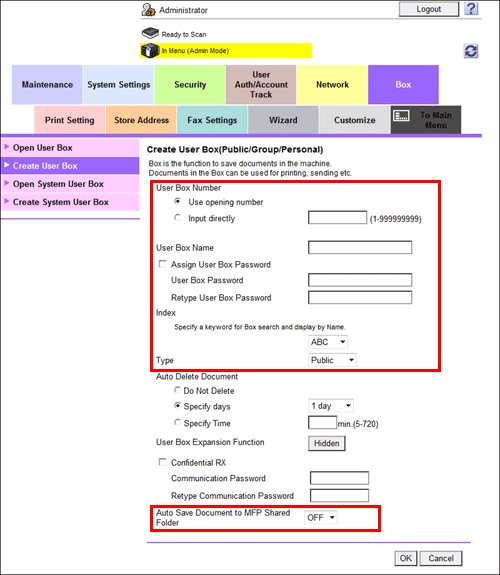 In the administrator mode, select [Box] - [Create User Box], then configure the following settings.
