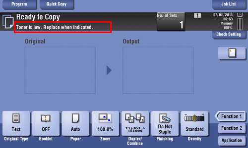When toner is depleted or when it is time to replace a Waste Toner Box, the message shown below appears. When this message appears, replace a Toner Cartridge or Waste Toner Box based on the maintenance contract.