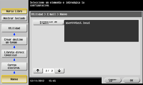 1. Toque [Utilidad] - [Registro destino/carpeta] - [Crear destino un-toque] - [Libreta direcc (pública)] - [Correo electrón.] - [Nueva].