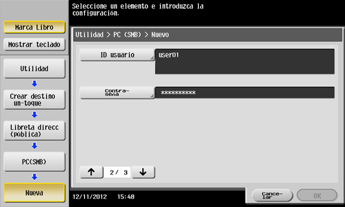 1. Toque [Utilidad] - [Registro destino/carpeta] - [Crear destino un-toque] - [Libreta direcc (pública)] - [PC(SMB)] - [Nueva].