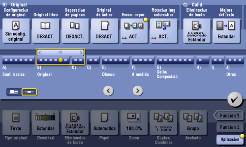 Toque [Aplicación] - [Original] - [Escan. separ.] y configúrelo en [ACTIVADO].