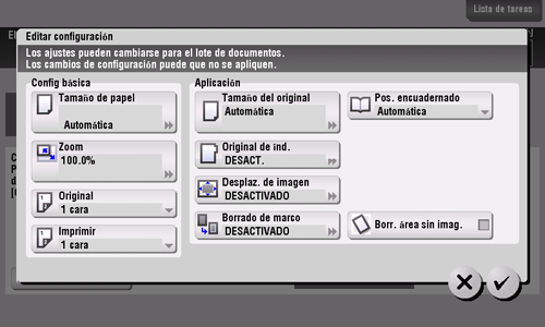 Los originales se escanean con ajustes diferentes para cada juego y se copian de forma colectiva. Use esta función cuando haya varios tipos de originales mezclados, como originales de 1 sola cara que se van a imprimir de un lado del papel, y originales de 2 caras que se van a copiar con ampliación. Una vez escaneados todos los originales, puede añadir números de página o funciones de acabado, tales como ordenar, para copiarlos.