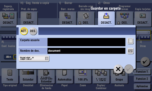 Seleccione [Aplicación] - [Otros] para configurar la opción [Guardar en carpeta] en [ACTIV.] y toque en el área de entrada o el icono de la [Lista carp. usuario].