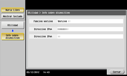 En el panel de control, seleccione [Utilidad] - [Info sobre dispositivo] y, a continuación, confirme la dirección IP de esta máquina.