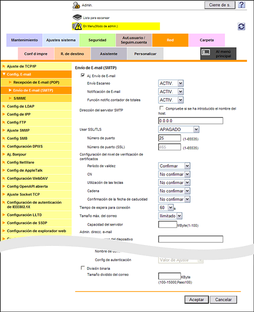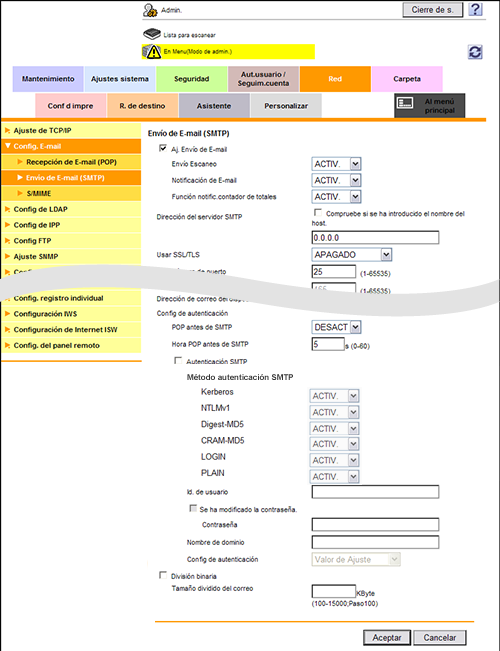 En el modo administrador, seleccione [Red] - [Config. E-mail] - [Envío de E-mail (SMTP)] y configure las siguientes opciones.