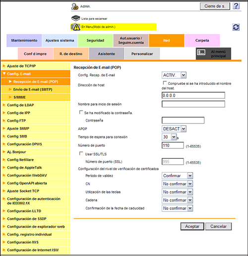 Configure las opciones de POP sobre SSL y APOP según su entorno. En el modo administrador, seleccione [Red] - [Config. E-mail] - [Recepción de E-mail (POP)] y configure las siguientes opciones.