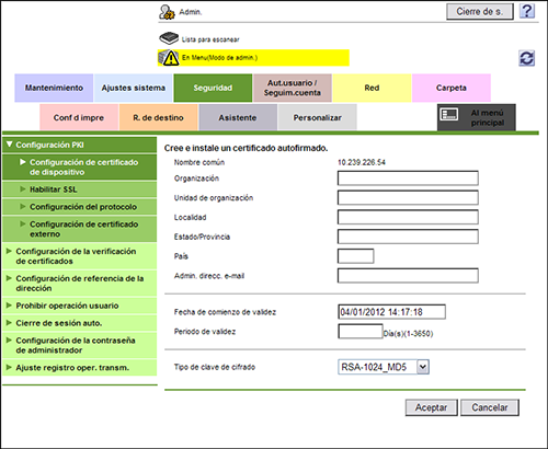 En el modo Administrador, seleccione [Seguridad] - [Configuración PKI] - [Configuración de certificado de dispositivo] - [Nuevo registro] - [Cree e instale un certificado autofirmado.] y especifique la información necesaria para crear un certificado, a continuación haga clic en [Aceptar].