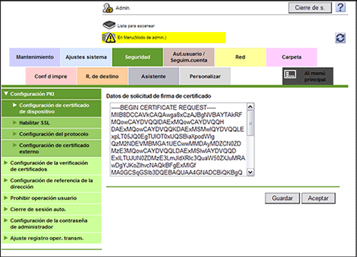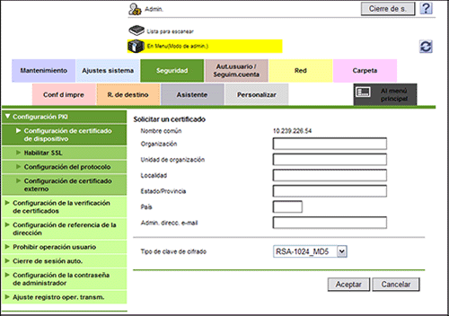 En el modo Administrador, seleccione [Seguridad] - [Configuración PKI] - [Configuración de certificado de dispositivo] - [Nuevo registro] - [Solicitar un certificado] y especifique la información necesaria para emitir un certificado, a continuación haga clic en [Aceptar].