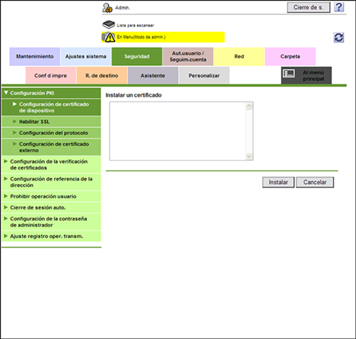 En el modo Administrador, seleccione [Seguridad] - [Configuración PKI] - [Configuración de certificado de dispositivo] - [Configuración] - [Instalar un certificado] y pegue los datos de texto enviados desde la entidad emisora de certificados (CA) y, a continuación, haga clic en [Instalar].