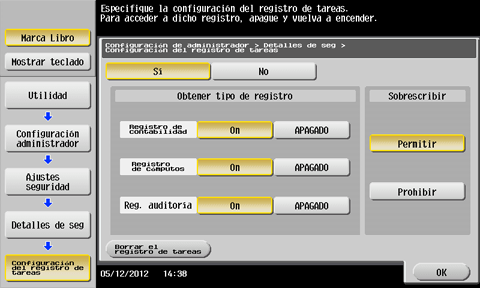 En el Panel de control, pulse [Utilidad] - [Config de Admin] - [Ajustes seguridad] - [Detalles de seg] - [Configuración del registro de tareas] y, a continuación, configure el siguiente ajuste.