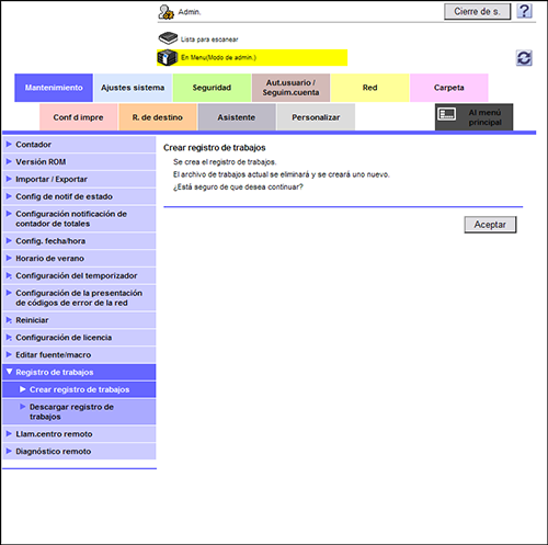 En el modo Administrador, seleccione [Mantenimiento] - [Registro de trabajos] - [Crear registro de trabajos] y, a continuación, haga clic en [Aceptar].