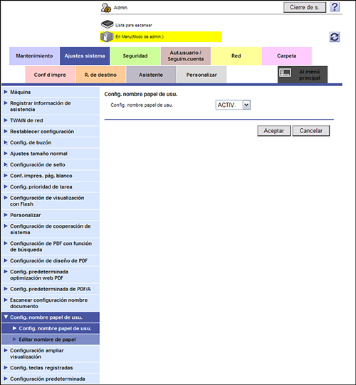 En el modo Administrador, seleccione [Ajustes sistema] - [Config. nombre papel de usu.] y, a continuación, ajuste [Config. nombre papel de usu.] a [ACTIV.].