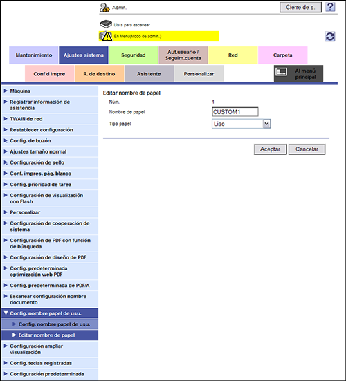 En el modo Administrador, seleccione [Ajustes sistema] - [Config. nombre papel de usu.] - [Editar nombre de papel] - [Editar] y, a continuación, configure las siguientes opciones.