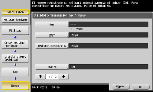 [Núm] | Utilice el teclado para introducir el número de registro para un destino de solo un toque. Si no se introduce ningún número, se asigna al destino el número más pequeño disponible. |
