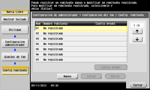 Si [Config de Admin] - [Ajustes de fax] - [Ajuste Trans/Recep] - [Instalación de línea de remitente individual] se ha ajustado en [ACTIV.] cuando se utilizan varias líneas, puede especificarse el nombre de remitente predeterminado para cada una.