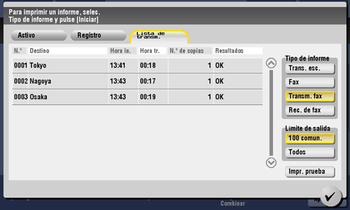 Especifique un tipo de informe en [Tipo de informe] de la ficha [Lista de transm.] y toque [Confirmar selección] y, a continuación, pulse Inicio.