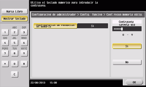 Seleccione una línea, toque [Sí], introduzca la contraseña para procesar los faxes guardados en una carpeta de usuario utilizando el teclado y, a continuación, toque [OK].