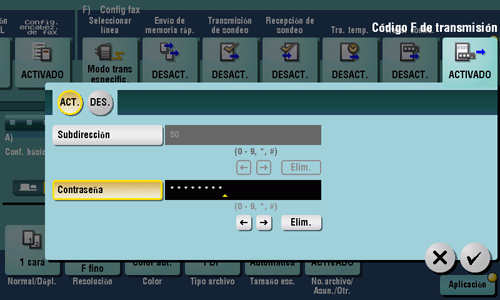 Toque [ACT.] e introduzca el número de carpeta de usuario confidencial en la máquina de destino en [Subdirección], utilizando el teclado.