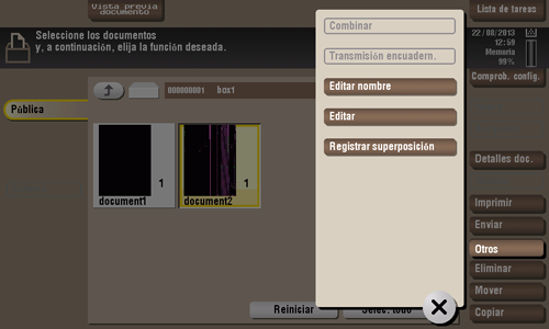 Para imprimir, toque [Otros] y, a continuación [Combinar]. Para enviar, toque [Otros] y, a continuación, [Transmisión encuadern.].