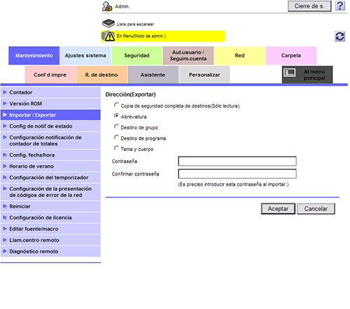 Una vez realizada la exportación con introducción de contraseña, la importación de los destinos a otra MFP requiere la introducción de contraseña.