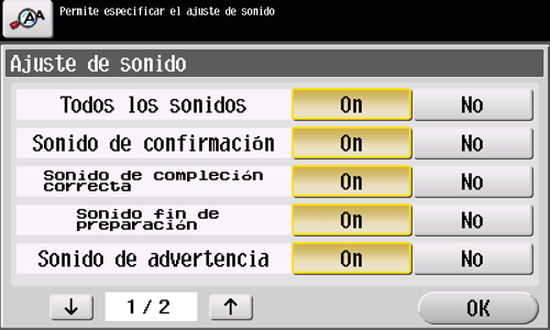 [Sonido de confirmación de operación] | [Sonido confirmación entrada] | Configure el tipo de sonido y el volumen que se debe emitir al pulsar una tecla en el panel de control o el panel táctil. Seleccione entre seis tipos de sonido y ajuste el volumen a [Alto], [Medio] o [Bajo]. |