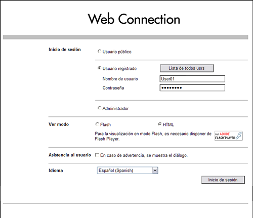 Introduzca el [Nombre de usuario] y [Contraseña] registrados en esta máquina y haga clic en [Inicio de sesión]. Una vez autenticado correctamente, se le permitirá utilizar Web Connection.