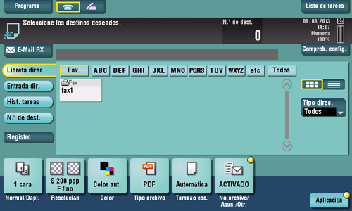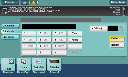 Los números de fax pueden especificarse en [Libreta direc.], [Entrada dir.], [Hist. tareas] o [Programa]. Para obtener más información sobre cómo especificar un destino, consulte Aquí. Para obtener más información sobre cómo especificar un programa de fax/escaneado, consulte Aquí.