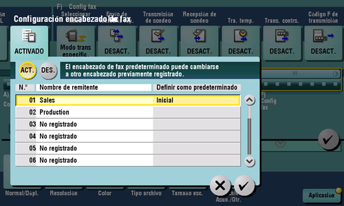 Los cambios en la [Config. encabez. de fax] solo son temporales. Es útil especificar nombres de remitente frecuentes como valores predeterminados cuando se registran nombres de remitente.
