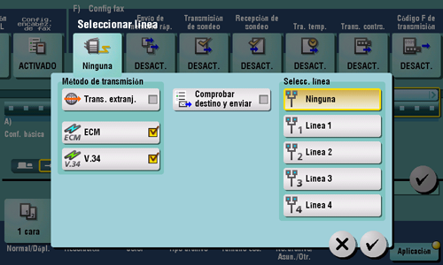 Toque [Aplicación] - [Config fax] - [Seleccionar línea].