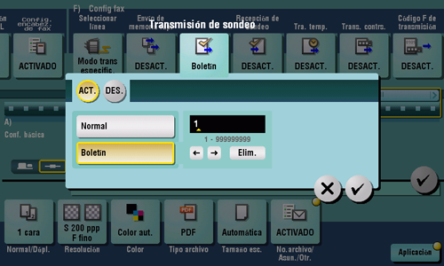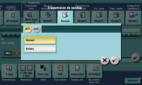 Toque [Aplicación] - [Config fax] - [Transmisión de sondeo] y, a continuación, toque [ACT.].