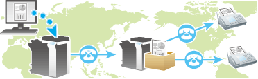 Si ha agrupado las estaciones de repetición y los destinatarios por área, puede reducir los costes de comunicación totales de la difusión de fax a todos los destinos. Esto es útil para la difusión a ubicaciones lejanas.