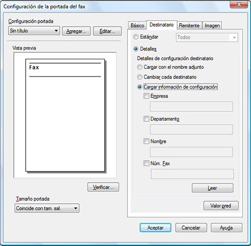 • Cuando haga clic en [Leer], se refleja la información de la primera línea de la lista [Destinatario] de la pantalla [Ventana emergente transmisión fax].